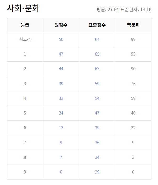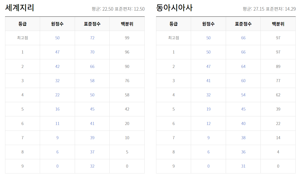 과목별 확정 등급컷은 페이지 가장 아래에 모두 나와있습니다.